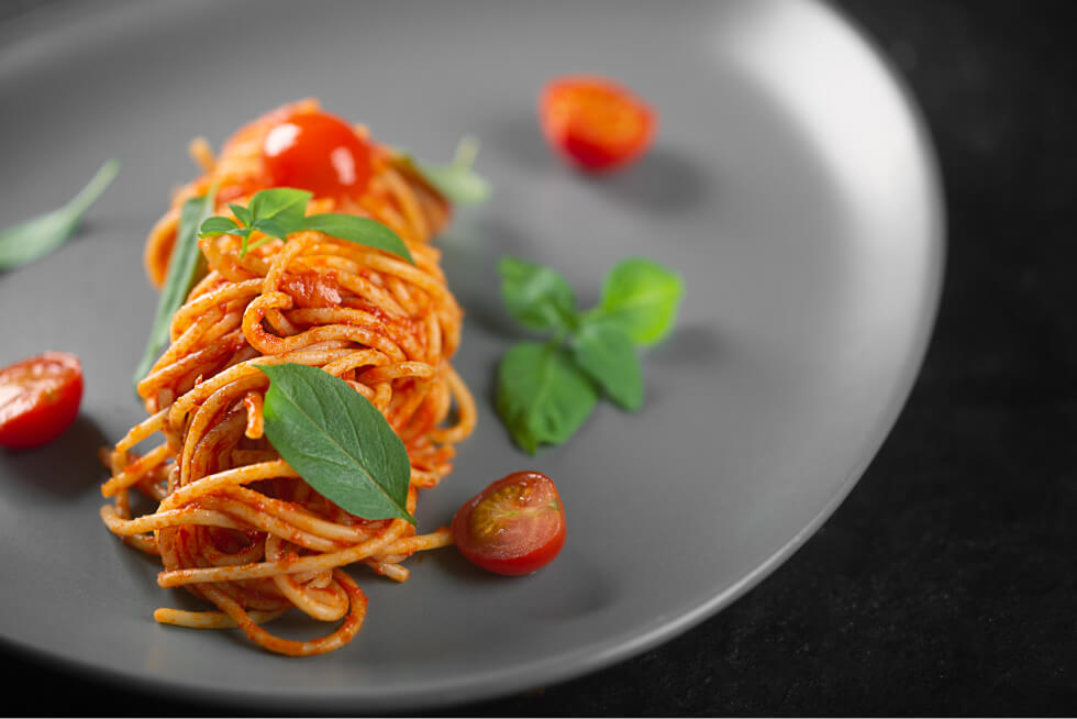 Al dente spaghetti in a fresh tomato sauce, topped with basil and cherry tomatoes for a light, comforting Italian favorite.